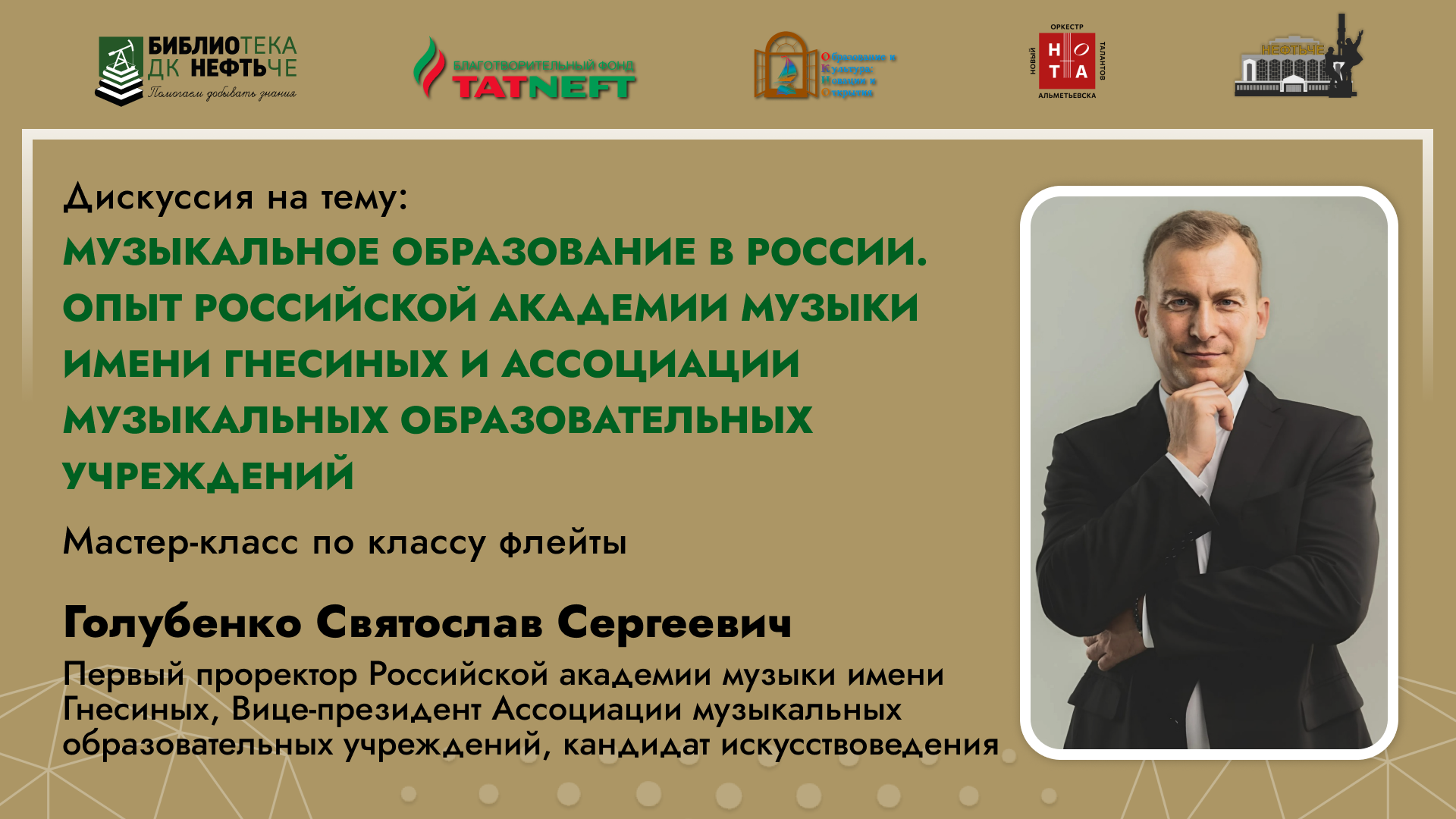Вместе с ним мы проведем дисскусию на тему: Музыкальное образование в России. Опыт Российской академии музыки имени Гнесиных и ассоциации музыкальных образовательных учреждений.